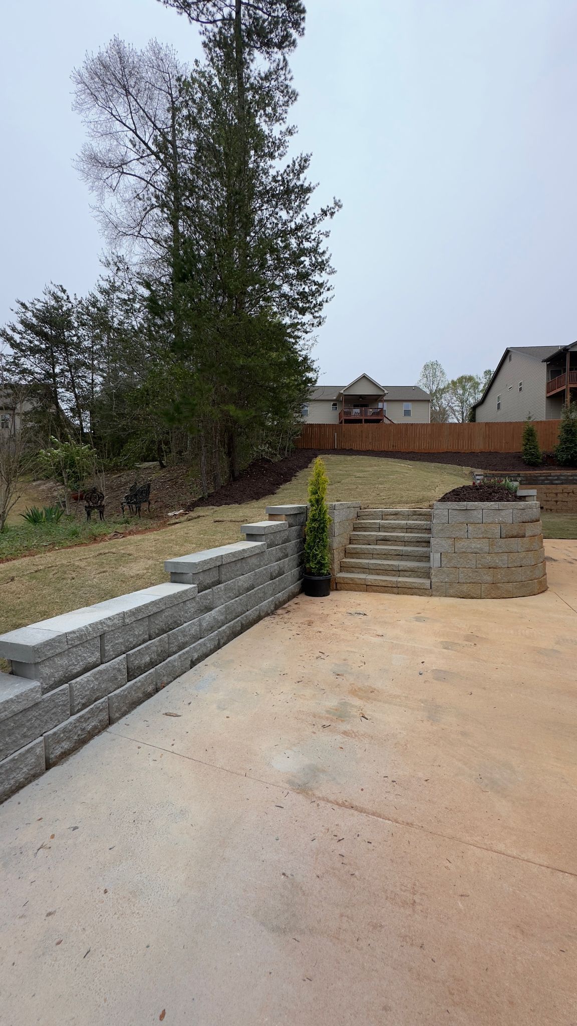 Concrete Patios & Hardscapes – We specialize in durable and elegant outdoor structures: Concrete Patios & Slabs, Paver Patios, Walkways, and Driveways, Retaining Walls (block, stone, timber), Decorative Rock Installation (River Rock, Gravel, etc.), Step Construction (stone or concrete), Fire Pits & Outdoor Living Areas, Landscape Edging (stone, metal, concrete borders).